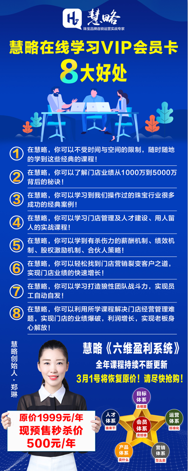 《慧略六維盈利系統》在線學習VIP會(huì)員卡原價1999元/年,推廣價999元/年,預售價500元/年!預售時(shí)間(jiān):2月17日-2月29日!3月份開(kāi)始,全部恢複推廣價!