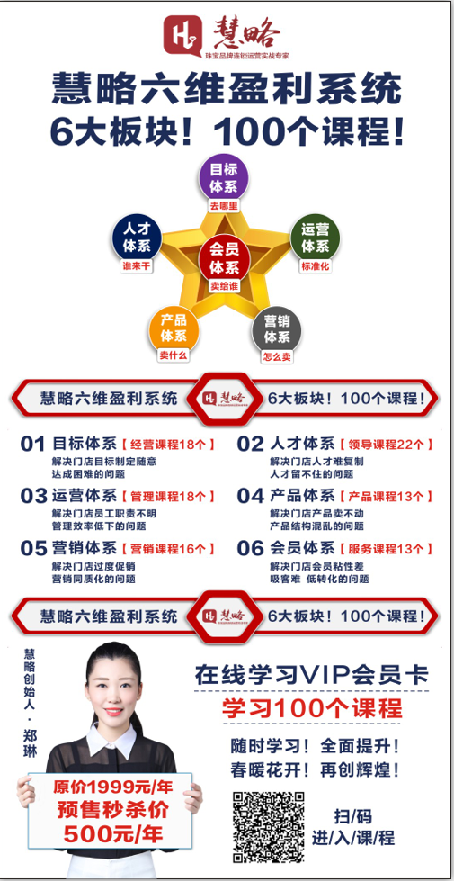 慧略創始人(rén)鄭琳老師(shī)順應市場(chǎng)變化,順應市場(chǎng)要求,親自線上(shàng)講課,重磅打造這100節課程為(wèi)珠寶行(xíng)業的老闆們答(dá)疑解惑,為(wèi)疫情之下的市場(chǎng)掃去陰霾,直擊市場(chǎng)痛點,共同應對疫情下的市場(chǎng)變化!助您在疫情之下,乘上(shàng)風口的直通(tōng)車(chē),開(kāi)創新的市場(chǎng)份額!