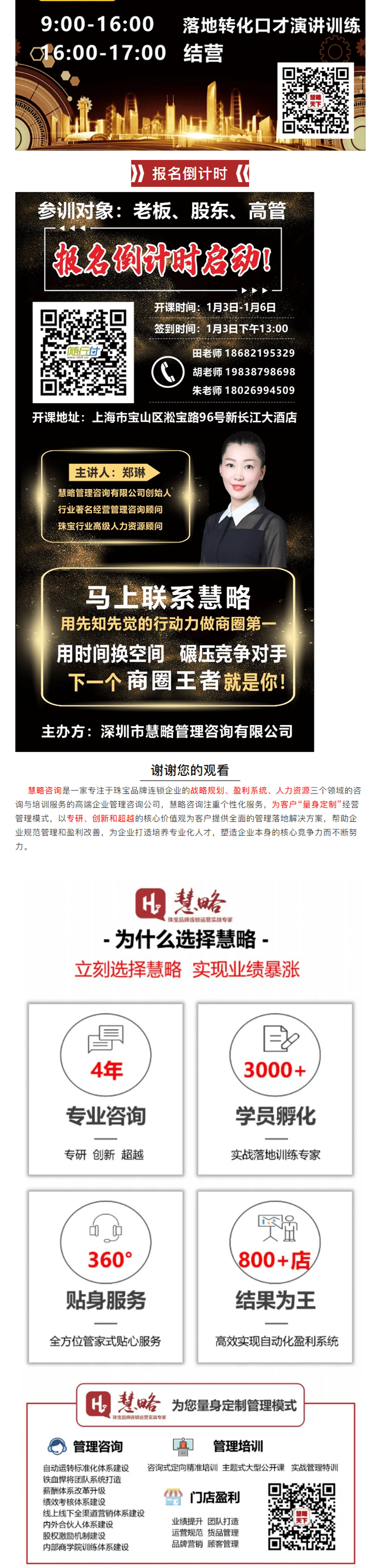 慧略在線顧問工作(zuò)時(shí)間(jiān):早上(shàng)9:00至晚上(shàng)6:00。我們為(wèi)您提供珠寶品牌連鎖企業管理(lǐ)咨詢與管理(lǐ)培訓的信息。